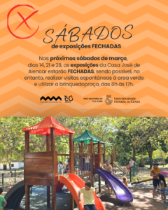 A Casa José de Alencar informa que, nos sábados 14, 21 e 28 de março, as exposições estarão fechadas para visitação.