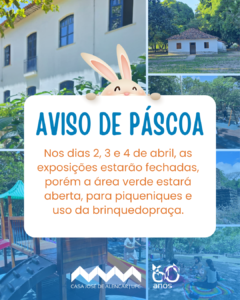 Nos dias 2, 3 e 4 de abril, em virtude do feriado da Semana Santa, as exposições da Casa José de Alencar estarão fechadas.