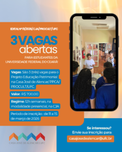 Informações: Edital nº 01/206/CJA/PROCULT/UFC, (85) 3366-9276 (WhatsApp) ou casajosedealencar@ufc.br.