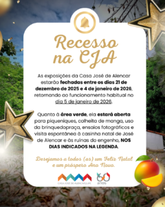 Em decorrência do recesso da Universidade Federal do Ceará, as exposições e a área verde da Casa José de Alencar ficarão FECHADAS na última semana do ano, com a reabertura no horário habitual no dia 5 de janeiro de 2026.